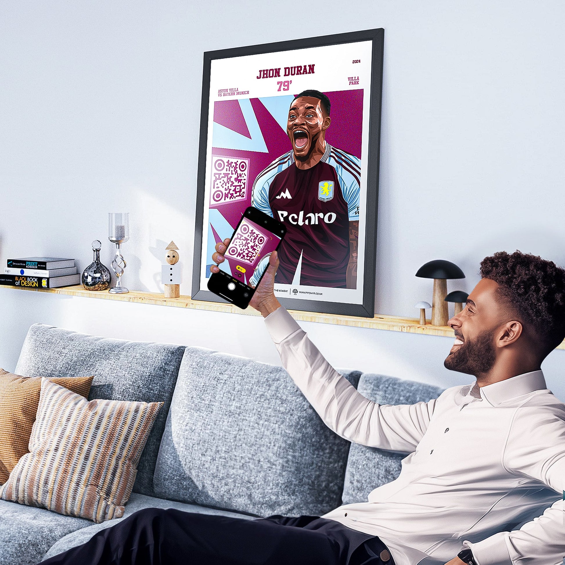 No frame is included. Just hold your phone camera up to the code. It’s the first football poster you can truly experience.