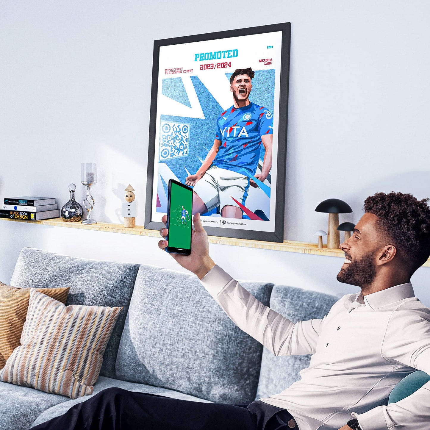 No frame is included. Just hold your phone camera up to the code. It’s the first football poster you can truly experience.