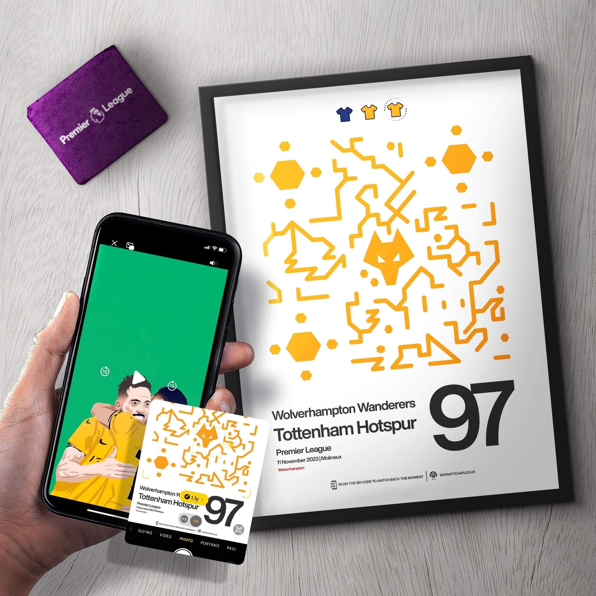 Wolves poster with 20% Summer sale. Scan the QR code to watch a video replay of this goal. 14-day hassle-free returns. 100% Satisfaction guarantee. 5/5 highly rated. A4, A3, A2, A1, A0 available. Football Art Gift Boyfriend, Dad, Sister +